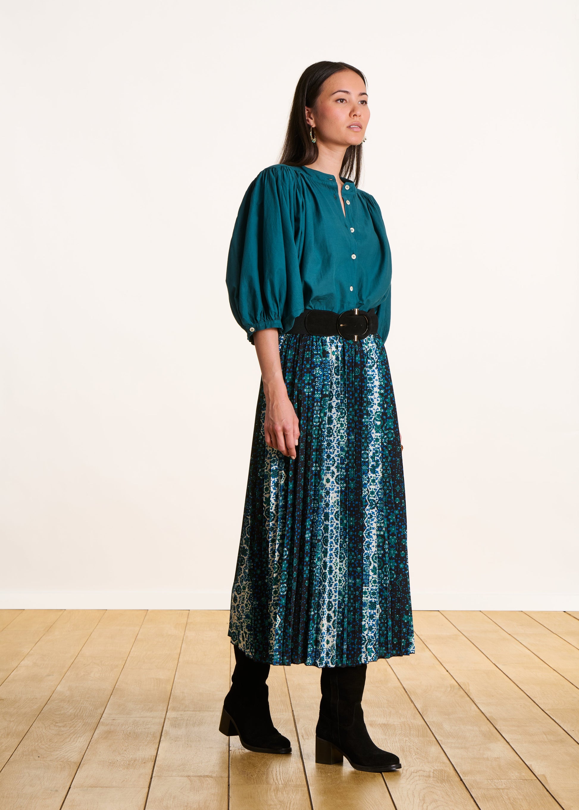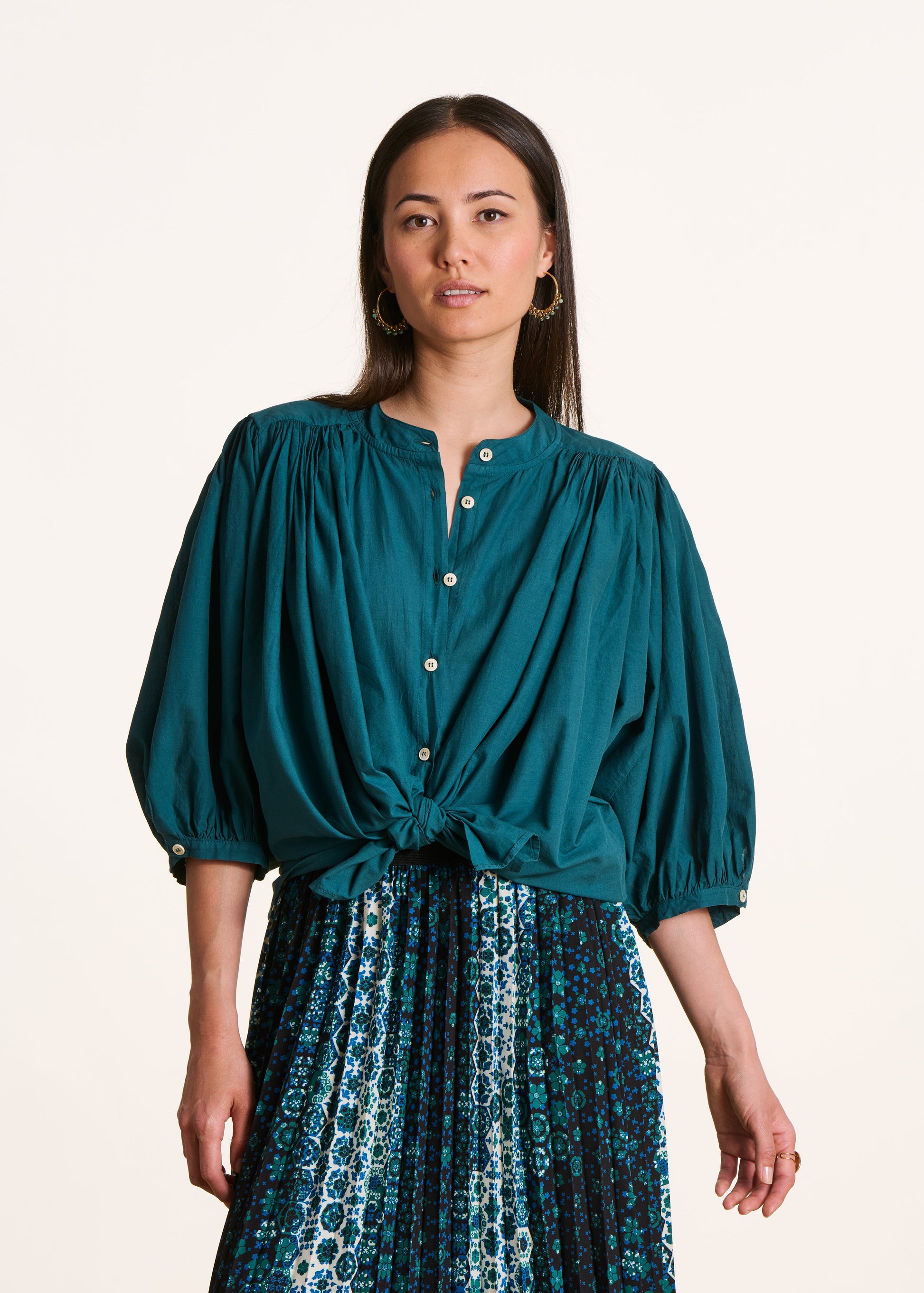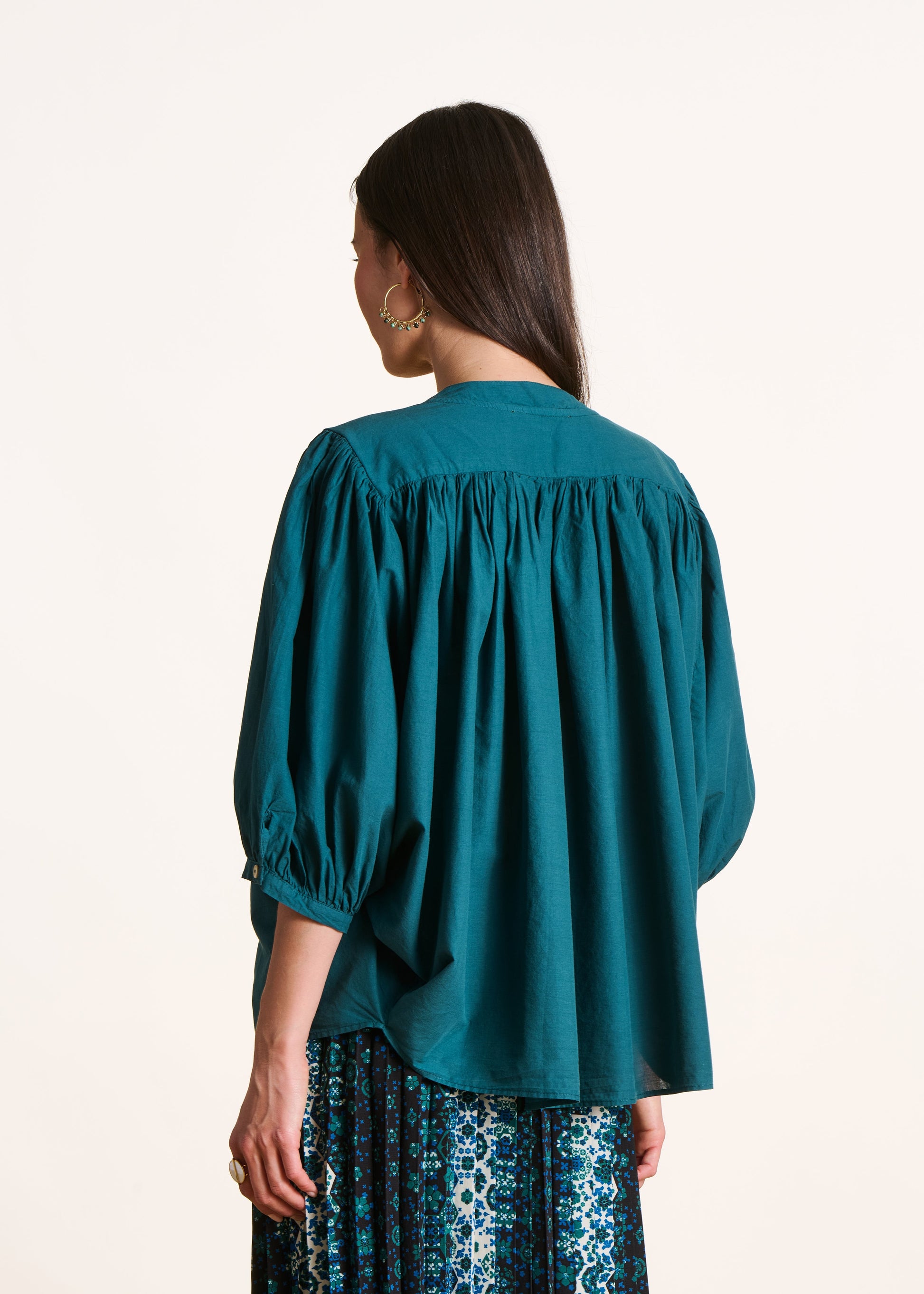 Chemisier bleu pétrole uni en coton manches 3/4